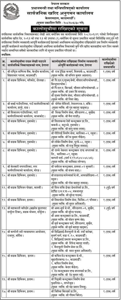 प्रधानमन्त्री तथा मन्त्रिपरिषद्को कार्यालयअन्तर्गतको सार्वजनिक खरिद अनुगमन कार्यालयले बिहीबार सूचना प्रकाशित गर्दै ती कम्पनीहरूलाई एक देखि दुई वर्षसम्मका लागि कालोसूचीमा राखिएको जानकारी दिएको छ ।